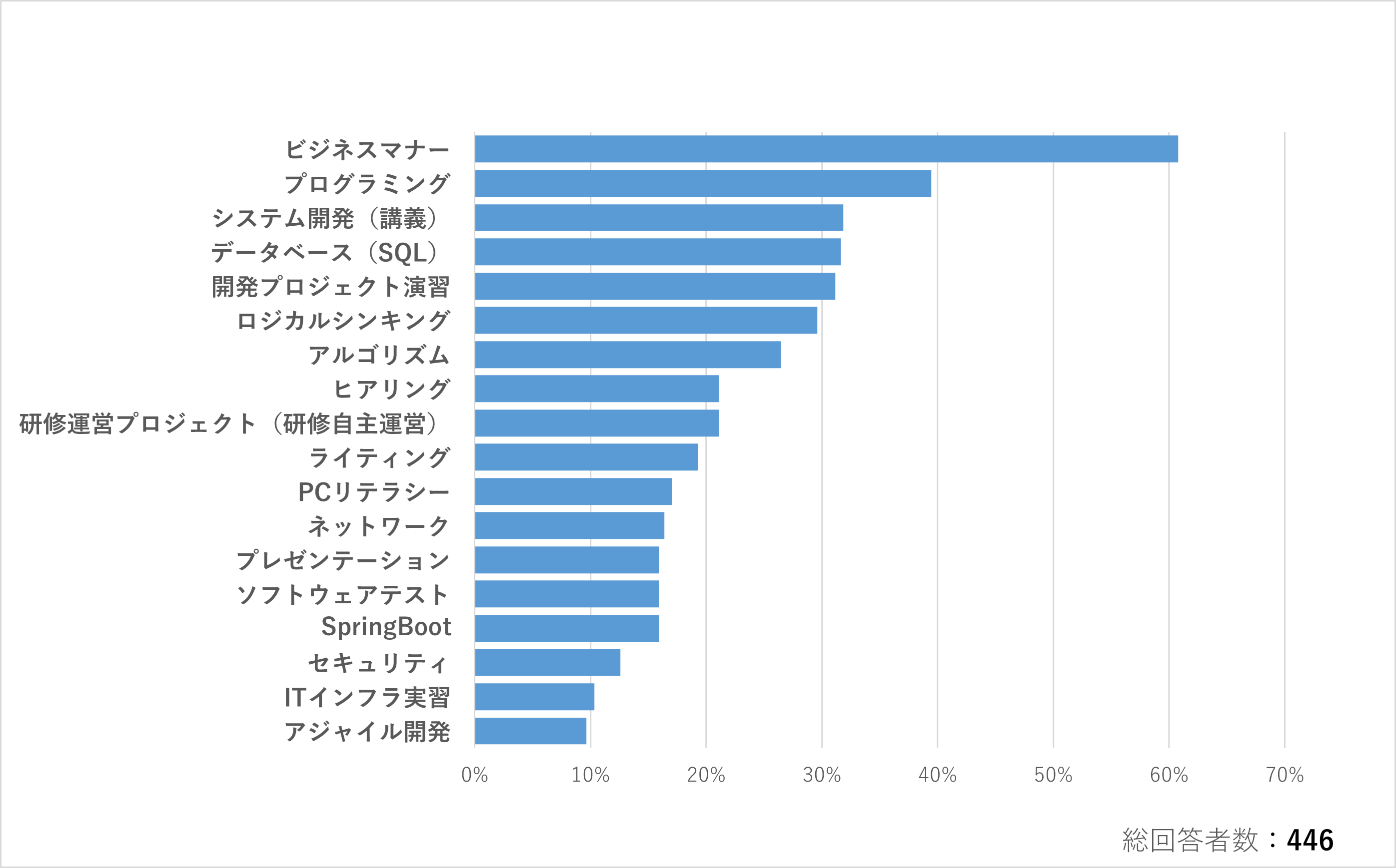 次点以降は、技術系が上位に並びました。IT初学者の割合は年々増えている背景もあり、「プログラミング」「システム開発」の研修に続き、新入社員が配属後の現場で触れる機会の多い「データベース」が挙がりました。