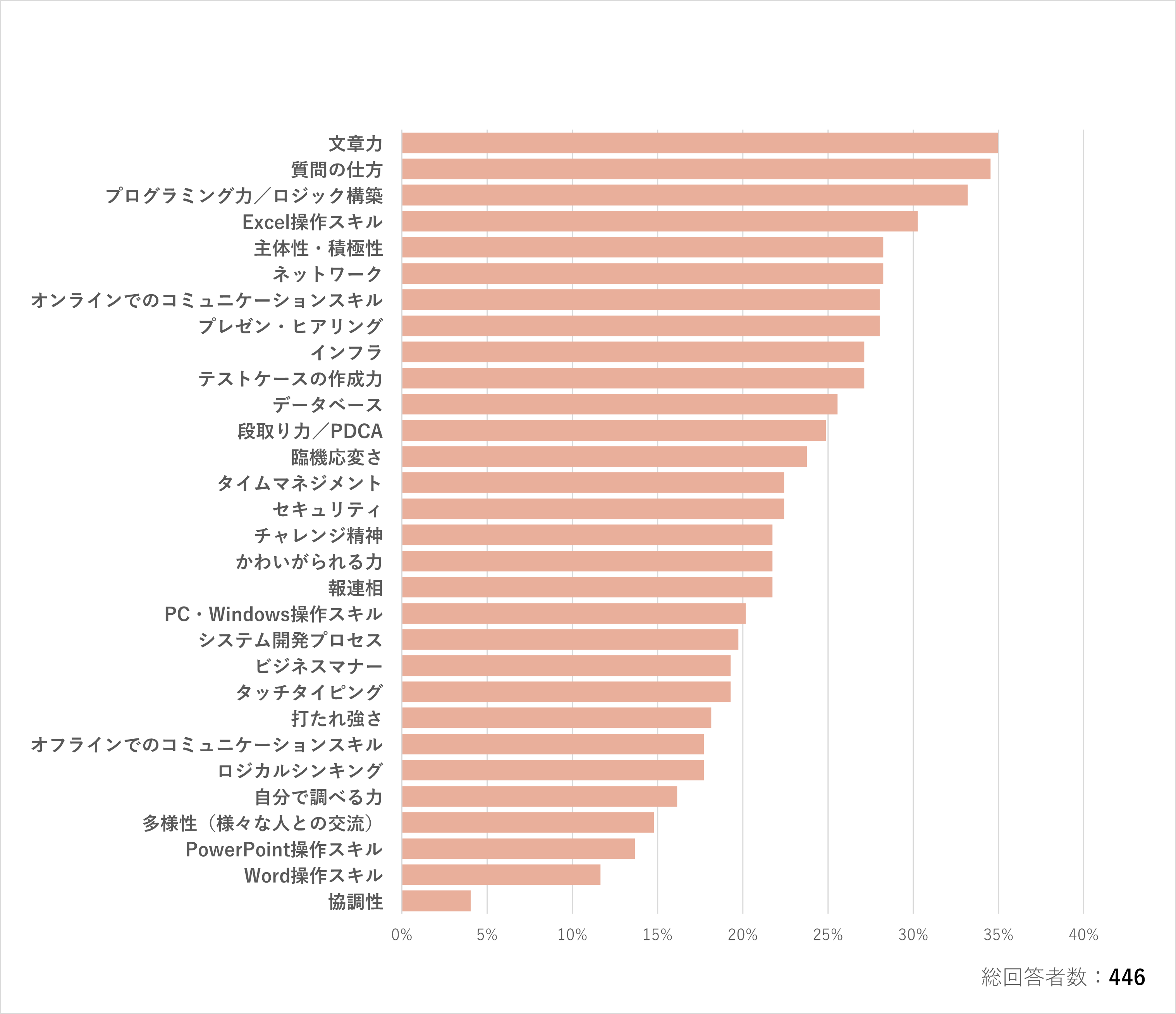 配属後、新入社員が自身のスキル不足としてもっとも多く挙げたのは、今年も「文章力」で35.0%の回答率でした。この結果は7年連続で同様となっており、ITの現場における文章作成の難しさが、依然として大きな課題であると考えられます。文章に関する具体的な悩みを記した個別コメントも複数見られました。