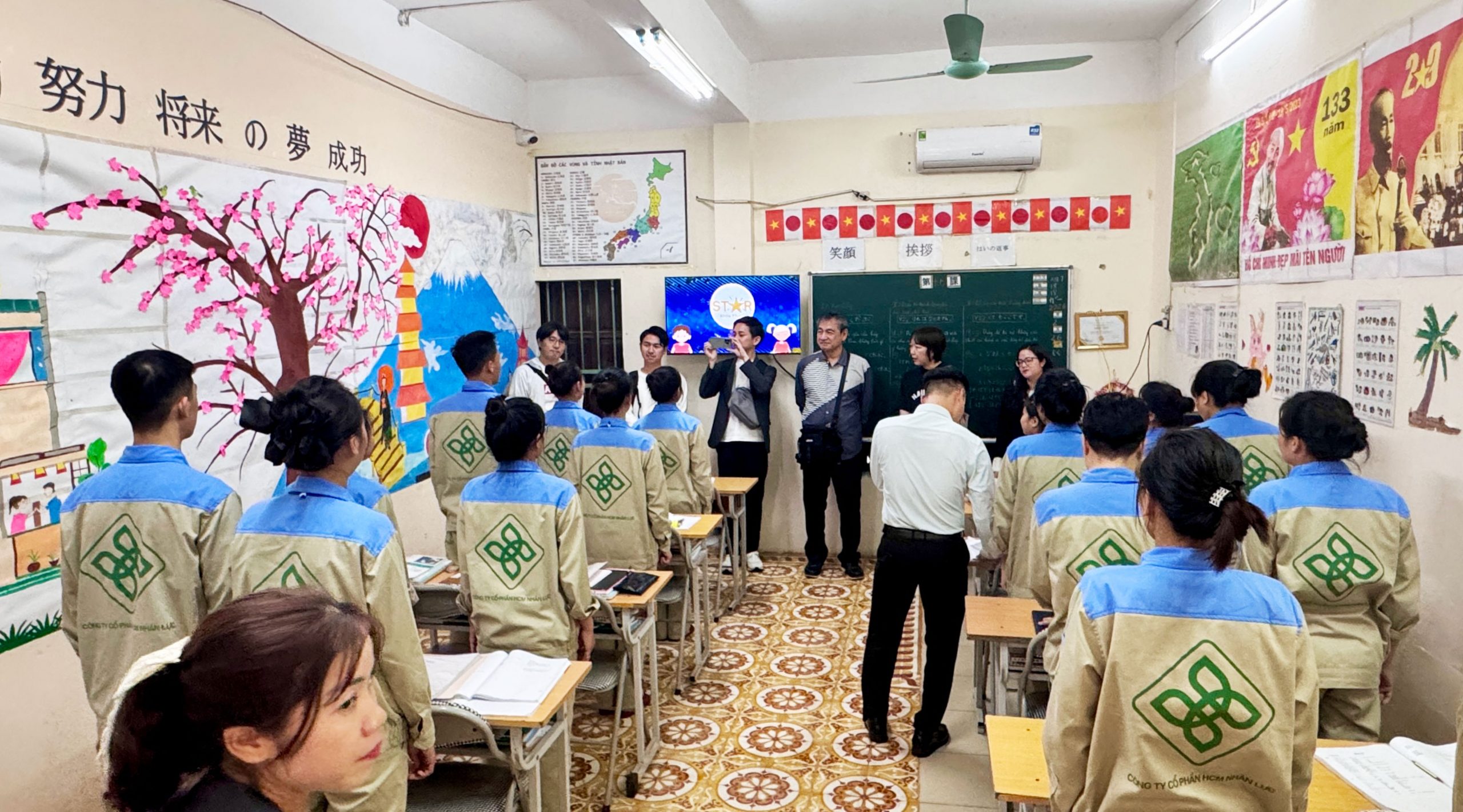 教室に入ると、元気な日本語の挨拶が響きます。学生たちは日本語だけでなく、日本企業で働くための文化やコミュニケーションも学んでいました。慣れない発音に苦戦しながらも、教科書が擦り切れるほど学ぶ姿。その真剣な姿勢に、視察一行も大きな刺激を受けました。