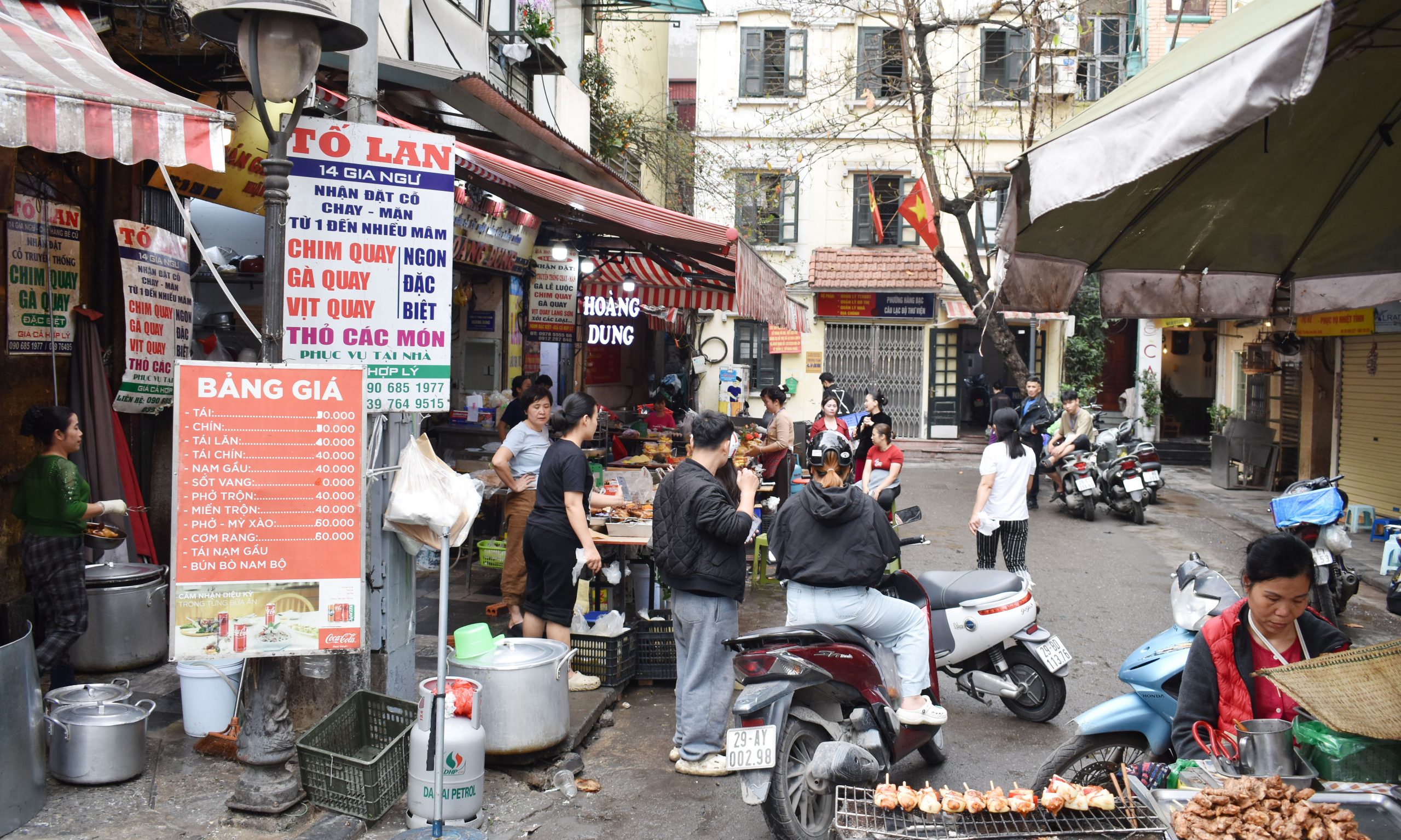 大通りの裏手には、小さな飲食店や商店が並び、路上で食事を楽しむ人々の姿があります。一方で大通りには高層ビルが立ち並び、急速に発展する都市の姿が広がっています。